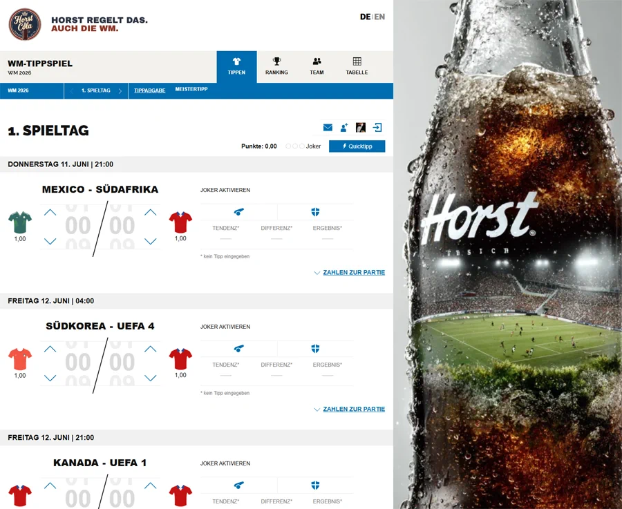 In der Regel innerhalb weniger Minuten per iFrame. Falls Sie das Tippspiel Standalone über unsere URL betreiben möchten, entsteht gar kein Integrationsaufwand.